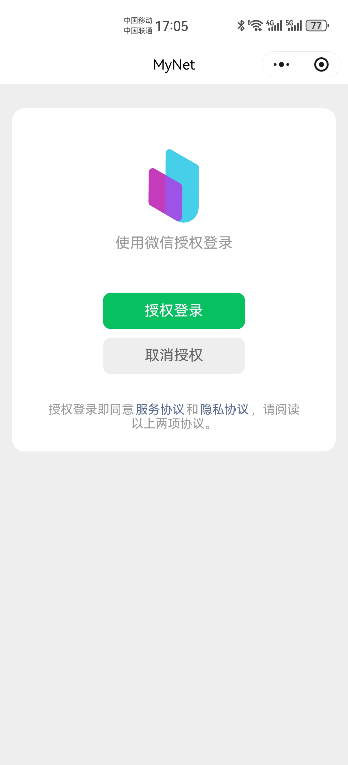 点击 “授权登录” 后,节点绑定成功,可以关闭微信小程序。 MyNet 出现类似如下界面: